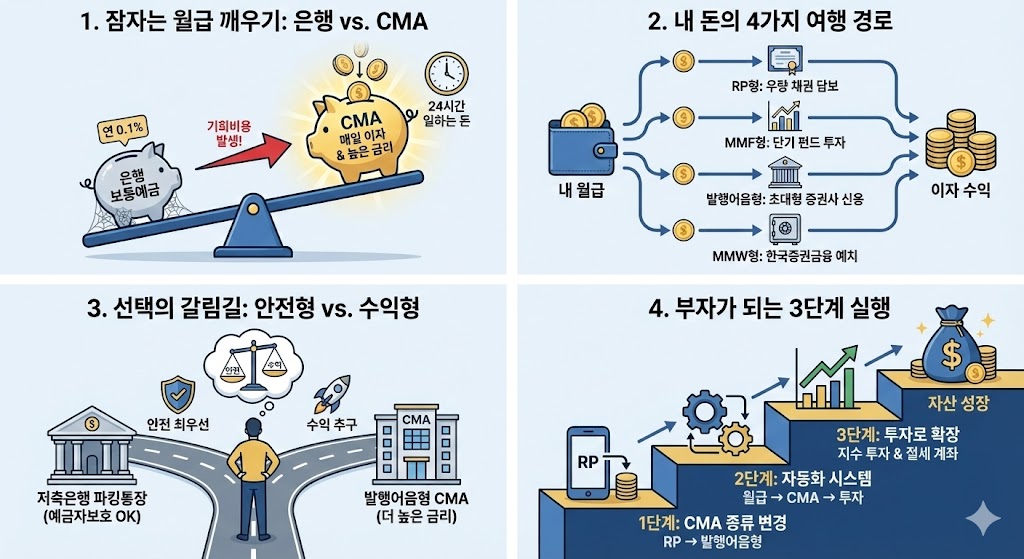 CMA 종류 바꾸기: 증권사 앱을 켜고 내 CMA가 무엇인지 확인하세요. 기본 'RP형'이라면, 금리가 더 높은 '발행어음형'으로 변경하세요. (앱에서 쉽게 바꿀 수 있습니다.)